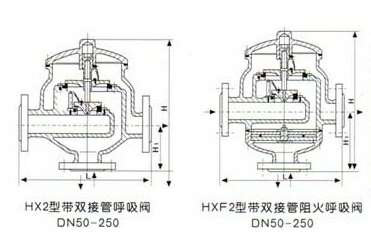 HXF2带双接管呼吸阀根据国家标准《石油化工企业设计防火规范》(GB50160-92)之规定:甲、乙类液体的固定顶罐,应设阻火器和呼吸阀。可见呼吸阀、阻火器是储罐不可缺少的安全设施。它不仅能维持储罐气压平衡,确保储罐在超压或真空时免遭破坏,且能减少罐内介质的挥发和损耗。上海上海庆轩企业形象策划有限公司厂生产的呼吸阀,具有结构紧凑、通气量大、泄漏量小、密封性能好等特点。