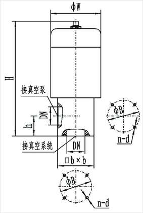 型号 | 通径(DN) | ΦW | ΦB | H | h | bxb | n-d | 匹配机械泵型号 |